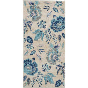 An elegant and detailed floral motif makes this Tranquil Collection area rug an ideal choice to bring a French country aesthetic to any room. Its pleasing palette combines shades of china blue with soft ivory and touches of pink detailing, in soft easy-care fibers.