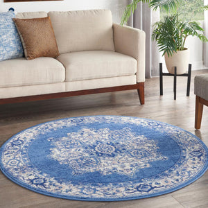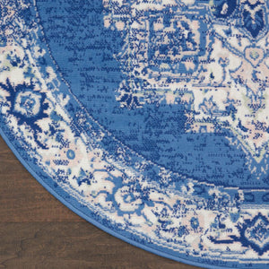 Rustic meets chic in this transitional area rug from the Whimsicle Collection. Inspired by 17th century Persian artistry, scrolling florals surround a classic center medallion design. On-trend navy blue and ivory tones are a versatile complement to French country, boho chic, and farmhouse styles of décor. This low-profile design is machine made of soft, easy to clean polyester fibers.
