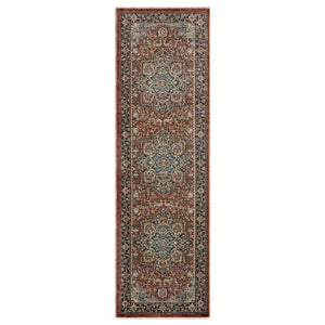 The Eliana collection is power-loomed of space-dyed polyester with a high twist level. The textural yarn offers a beautiful lustrous finish and a super soft hand. Traditional Persian styling comes to life as striking mineral tones of warm cinnabar and cool cordierite contrast with subtle earthy shades of moss green and birch. Machine made in Egypt.