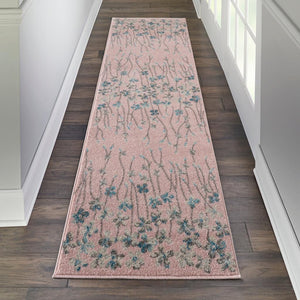 Delicate flowers blow on a gentle breeze in this delightful botanical rug from the Tranquil Collection. Watercolor tones of grey and blue on a pink field create a marvelous sense of softness to bring a boho look to your unique decorating style.