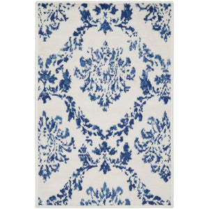 In a striking balance between rustic and elegant, this Whimsicle Collection area rug channels classic French country charm with its oversized damask pattern. A subtly distressed patina in a neutral blend of ivory and navy creates a comfortably lived-in effect that is at once welcoming and pleasing. Machine made of soft polyester with a low profile for a seamless fit under your sofa, dining room table, or near areas that need door clearance.