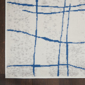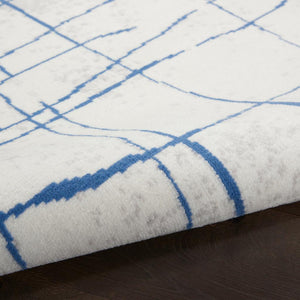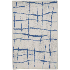 With its abstract linear design and lightly distressed accents, this area rug from the Whimsicle Collection adds a distinctively sleek and modern touch to your living room, bedroom, dining room, or home office. A neutral palette of blue, grey, and ivory easily complements any style of decor. This cool and contemporary design is machine made of low profile, easy to clean polyester fibers.