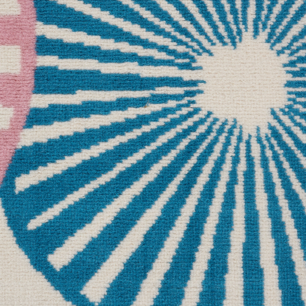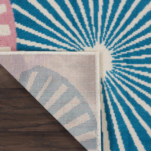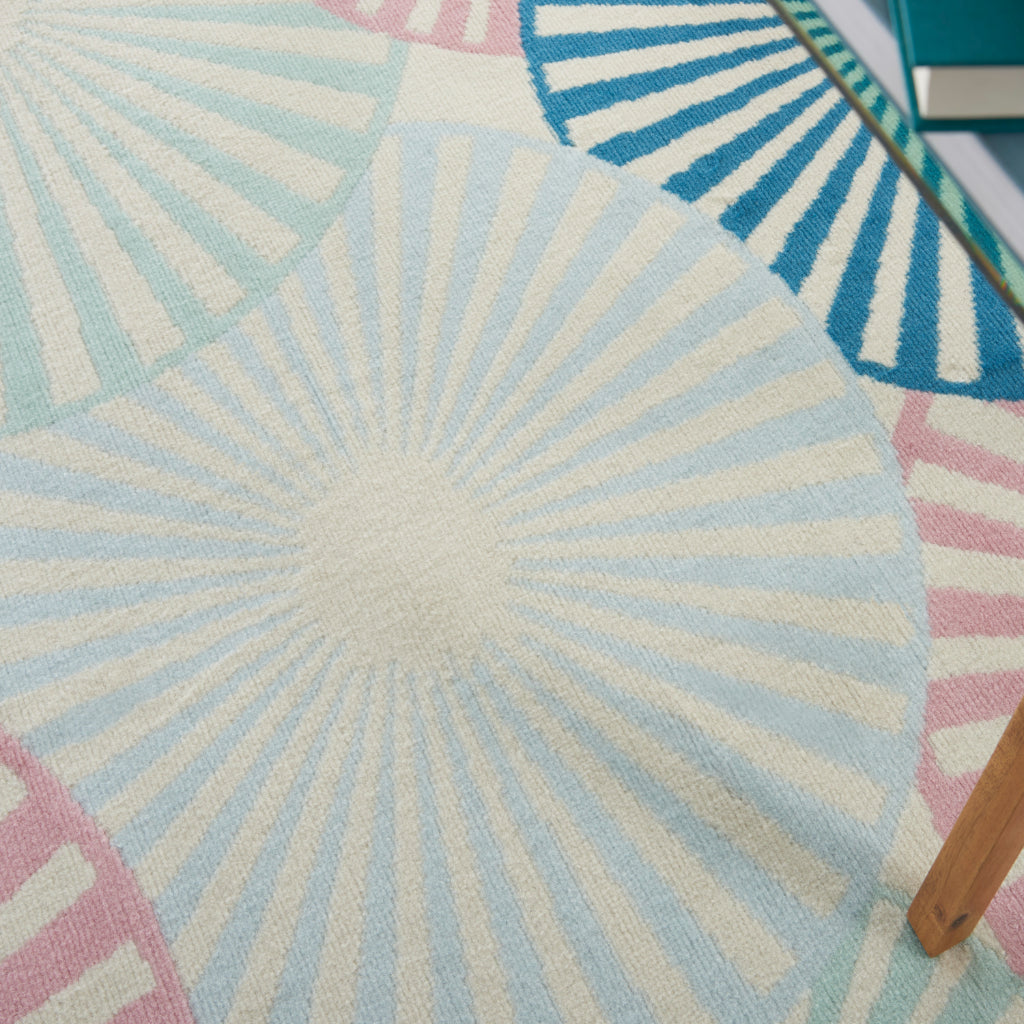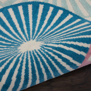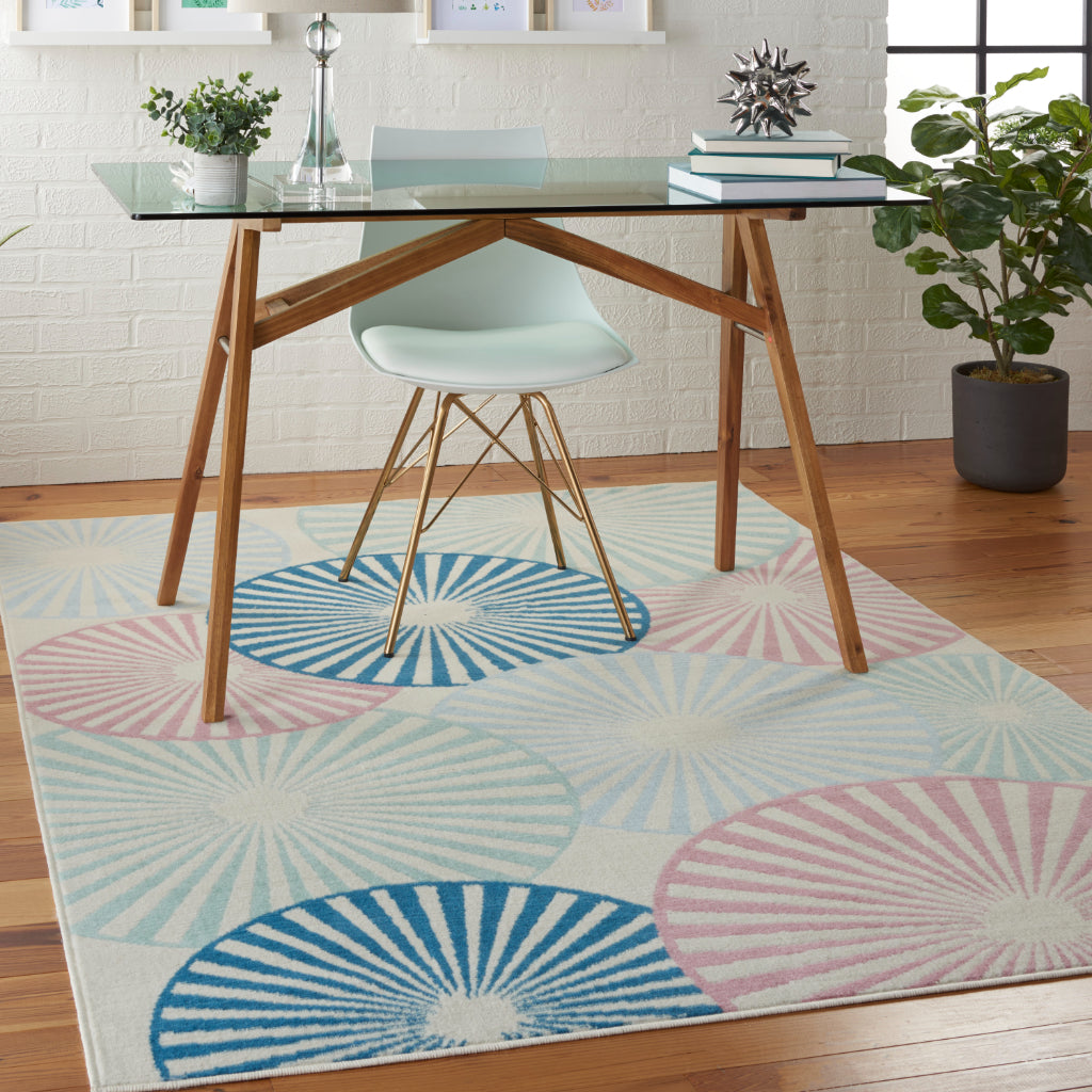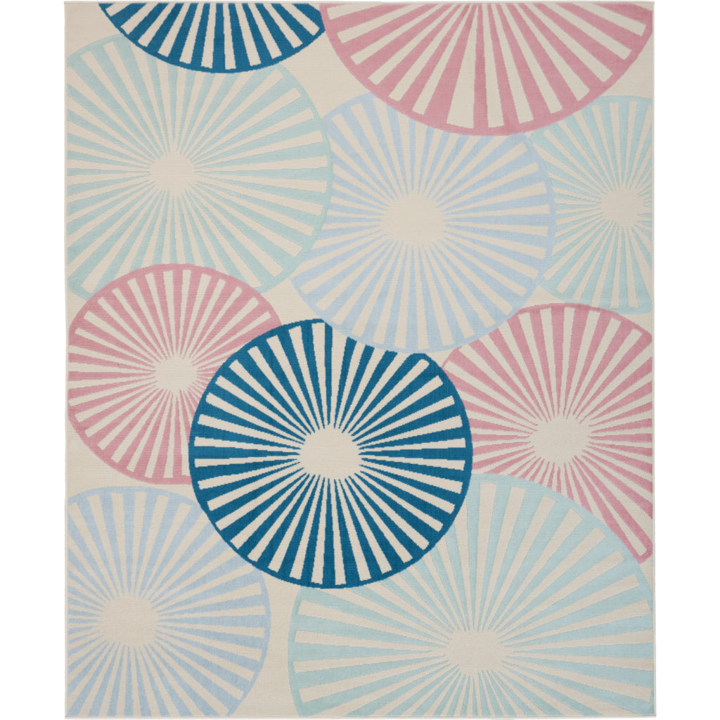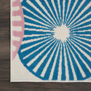 An array of overlapping orbs create captivating energy and vibrance in this Grafix area rug. Radiating circular patterns in soft blue, white, and pink adorn an ivory field in a burst of contemporary flair.