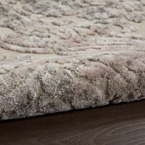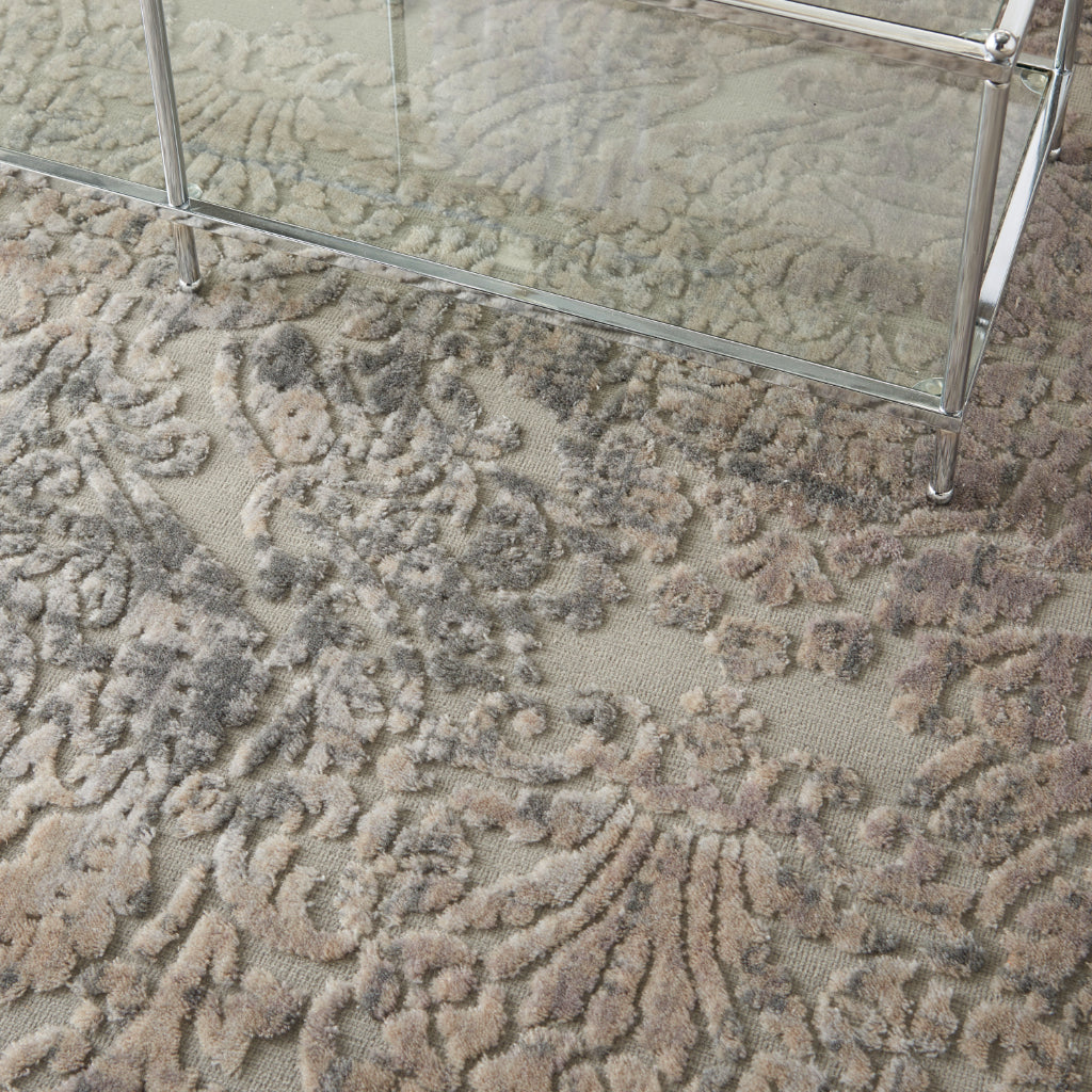 Expert hand carving and a high-low loop pile construction give this area rug extraordinary touch appeal. Sublime shading in subtle grey gradations impart a damask design with an intriguing air that will lend an exotic allure to any setting.