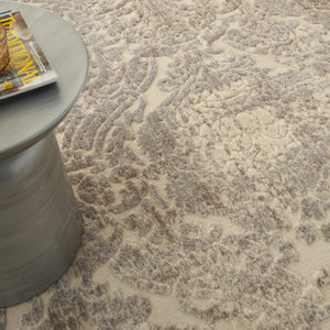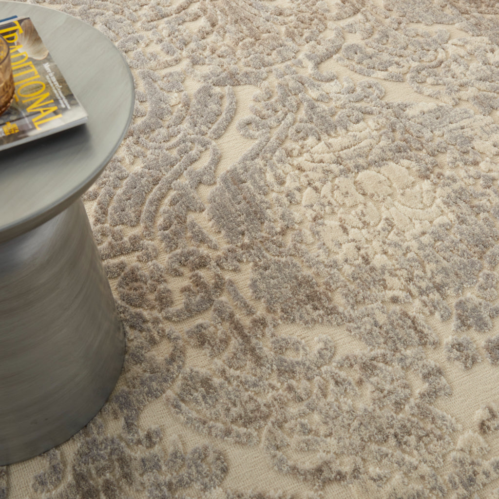 Expert hand carving and a high-low loop pile construction give this area rug extraordinary touch appeal. Sublime shading in subtle gradations of grey and ivory background impart a damask design with an intriguing air that will lend an exotic allure to any setting.